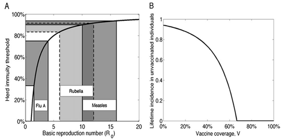 This leads nicely onto the final premise. The level of the population needing to be immune to reach what we consider to be herd immunity, is always extremely high. In nearly all recorded cases of successful herd immunity the percentage of the population immunity is extremely high. Most studies measure this by vaccine uptake and as can be seen in the below graphic, the relationship between incidence of disease and coverage of the vaccines available for said diseases shows how important vaccination protocols are for those who cannot receive them. Part B of the graph is modelled on the non-vaccinated population i.e. the percentage of vaccine coverage listed along the X axis, reflects the benefit to the unvaccinated population in terms of the incidence of the disease amongst that population, listed on the Y axis.